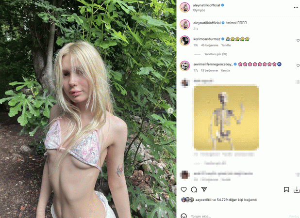 Üstüne küçük gelen pembe bikini giyen Aleyna Tilki, deniz ya da plaj yerine ormanda poz vermeyi tercih etti. Ağacın üstüne oturarak pozlar veren şarkıcı, 3 milyon takipçisinin bulunduğu Instagram hesabından yaptığı paylaşıma "Hayvan" notunu düştü. Bikinisiyle dikkat çeken Aleyna Tilki, zayıflığıyla da herkesi şaşırttı. Tilki'nin fiziğini gören kullanıcılar "Yemek yemiyor musun? Bu ne zayıflık" ve "Kurumuşsun resmen" yorumunu yaptı.