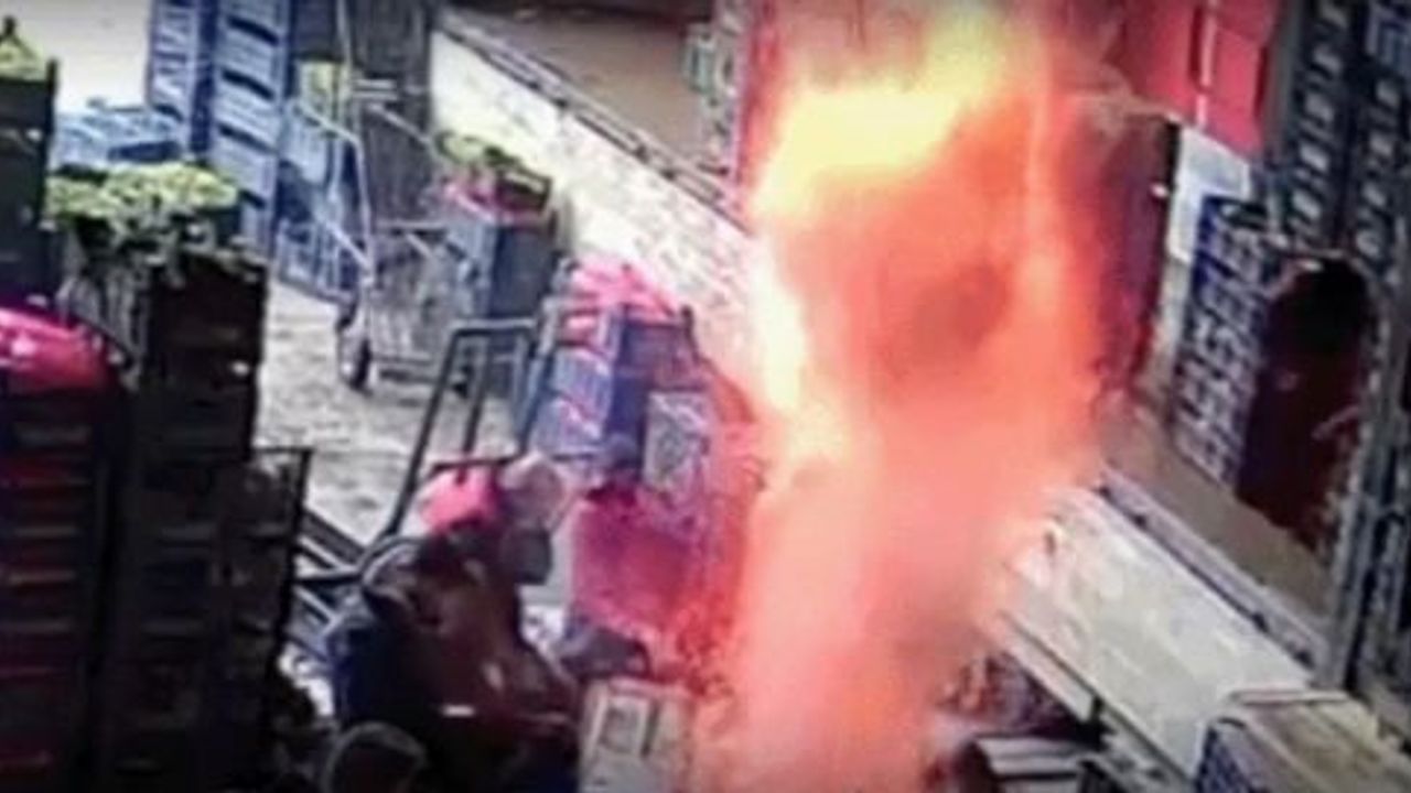 ALANYA Toptancı Hali'nde soğuk havada ısınmak isteyen bir grup işçi, teneke kovada ateş yaktı. İşçiler ateş etrafında toplanıp ısınırken patlama oldu. Patlamayla birlikte beton parçaları ve kovada yanan maddeler etrafa saçıldı. Panikle kaçışan işçiler olayı yara almadan atlatırken, kovanın konulduğu noktada beton zeminde hasar oluştu. Bu arada olay, güvenlik kamerasına da yansıdı. Olaya tanık olan Orhan Metin, "Her zaman ısınmak için işçilerin yaktığı bir şey. Tenekede ateşi yakınca alttaki beton ısınıyor. Patlama sesini duyduk, gittik baktık herhangi bir olumsuzluk yok çok şükür. Bayağı bir ses çıktı" dedi.
