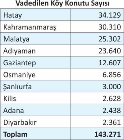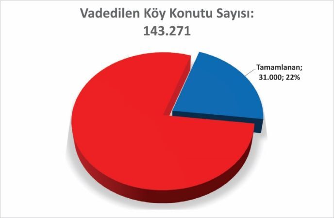 Benzer bir durum köy konutlarının inşasında da mevcuttur. Depremin ardından 143 bin 271 köy konutunun yapılacağı vadedilmiştir. Şu ana kadar Bakanlık tarafından yapılan açıklamalarda köy konutlarının yalnızca 22’sinin tamamlanma aşamasına geldiği anlaşılmaktadır. 31 bin köy konutunun 2024 sonu itibariyle tamamlandığı belirtilirken, şu ana kadar ihalesi yapılan toplam köy konutu sayısının ise 60 bin civarında olduğu ifade edilmektedir.