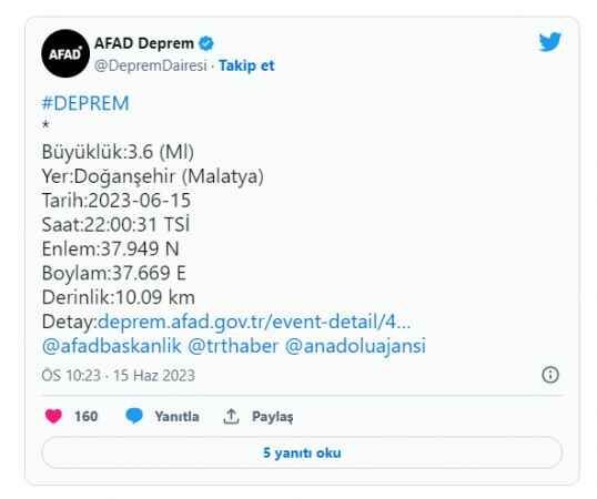 Kahramanmaraş'ta 6 Şubat'ta meydana gelen iki büyük depremin ardından bölgede artçılar devam ediyor. Son olarak saat 22.00'de Malatya Doğanşehir'de 3.6 büyüklüğünde bir deprem meydana geldi. AFAD depremin derinliğini 10 km olarak duyurdu.