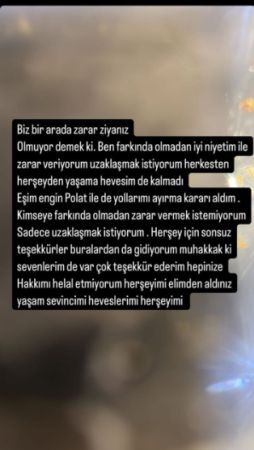 Dilan Polat’ın açıklamasının ardından Engin Polat da sosyal medya hesabından bir paylaşım yaptı. Engin Polat, eşinin zor bir süreçten geçtiğini ve duygusal bir anında bu paylaşımı yaptığını belirterek, "Yaşanan durumlardan dolayı eşim çok etkilendi. Bizlere zarar verdiğini düşünerek böyle bir açıklama yaptı. Biz bir aileyiz ve birbirimize her koşulda bağlıyız. Ben ve eşim bir süre sosyal medyada olmayacağız" dedi.
