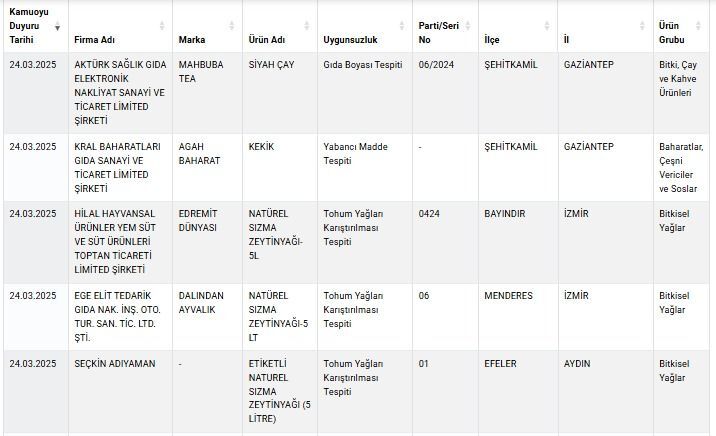 Aydın, İzmir ve Gazientep'te baharatlarda ve zeytin yağlarındaki hileler Bakanlık tarafından ifşa edildi. Zeytinyağından bitkisel yağ çıktı. Kısmetoğlu Beyti'nin birçok şubesindeki ürününde kanatlı eti ve deri dokusu tespit edildi.Aksaray ve Kahramanmaraş'taki peynir firmalarının ürünlerinde düşük yağ oranları çıktı.
