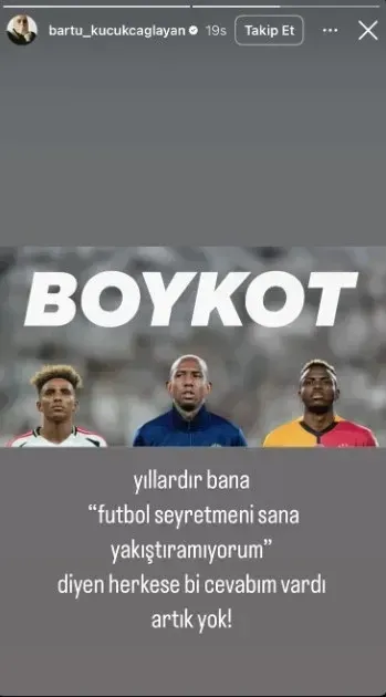 Ünlü oyuncu ve şarkıcı Bartu Küçükçağlayan,  ülkede yaşanan hiçbir şeye dair bir açıklama yapmayan üç büyük futbol kulübü Galatasaray, Fenerbahçe ve Beşiktaş'a tepki göstererek boykot etme kararı aldığını açıkladı.