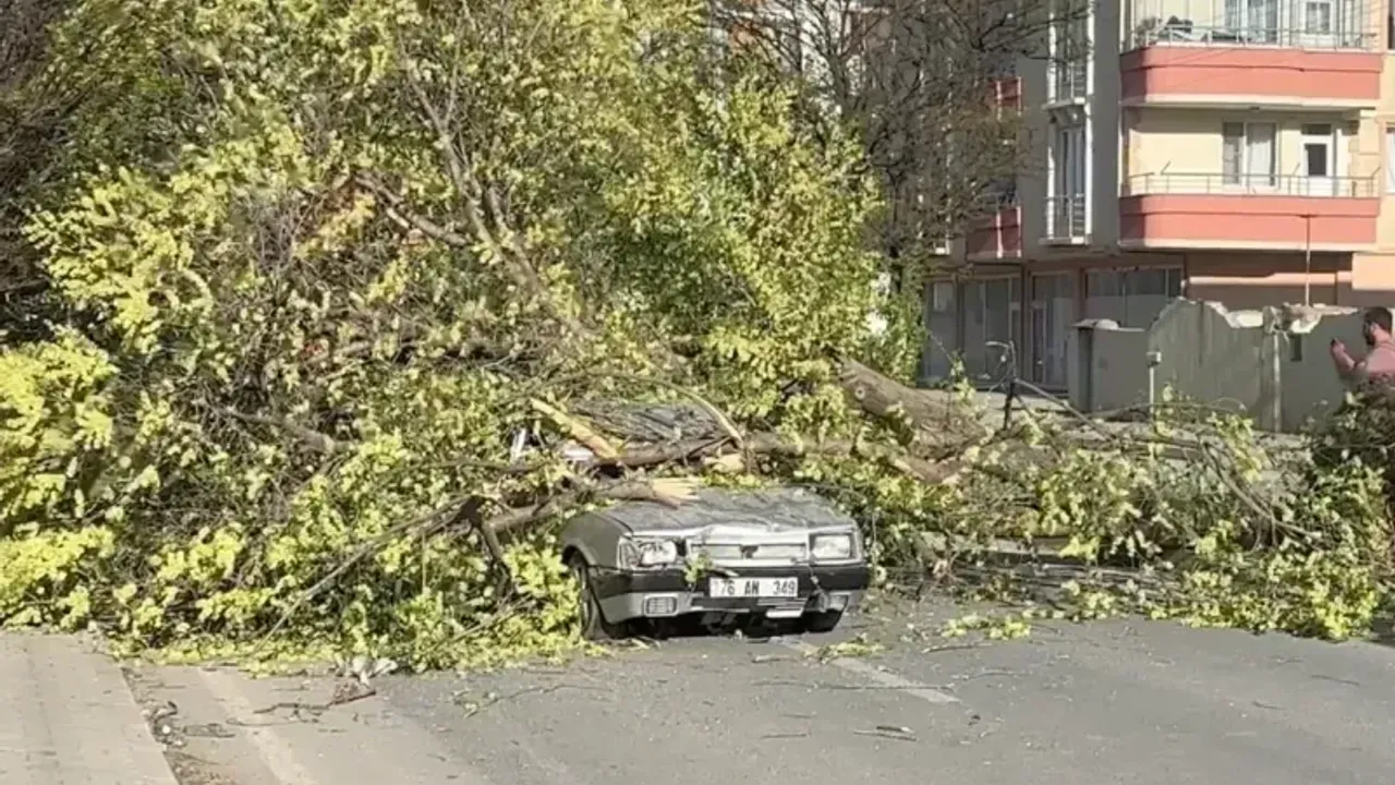 Rüzgarın etkili olduğu Iğdır'da sürücüsünün ismi öğrenilemeyen otomobil İlham Aliyev Caddesi'nde seyir halindeyken üzerine refüjdeki ağaç devrildi. Sürücü, otomobil içinde sıkıştı.
