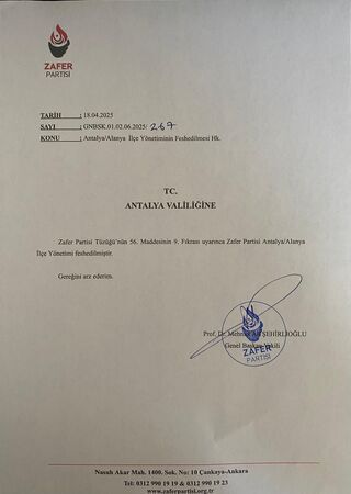 Fesih kararına ilişkin resmi yazı, Zafer Partisi Genel Başkan Vekili Mehmet Ali Şehirlioğlu’nun imzasıyla 18 Nisan 2025 tarihinde Antalya Valiliği’ne iletildi. Yazıda, “Zafer Partisi Tüzüğü’nün 56. maddesinin 9. fıkrası uyarınca Zafer Partisi Antalya/Alanya İlçe Yönetimi feshedilmiştir. Gereğini arz ederim.” ifadelerine yer verildi. Yeni ilçe yönetiminin önümüzdeki günlerde görevlendirilmesi bekleniyor.