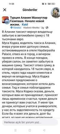 Öte yandan Alanya Belediye Başkanı Osman Tarık Özçelik’in kısa süre önce Finlandiya Turizm Fuarı'nda yaptığı bir anket çalışmasında, Finli turistlerin en çok şikayet ettiği konuların başında Alanya’daki taksiciler gelmişti. Bu olay, Alanya’da taksicilere yönelik olumsuz algının düzelmesi için umut ışığı oldu. Musa Koca’nın bu tavrı, hem Alanya'nın hem de Türkiye’nin misafirperverliğini ve dürüstlüğünü dünyaya bir kez daha gösterdi. (Gülser YİĞİT)