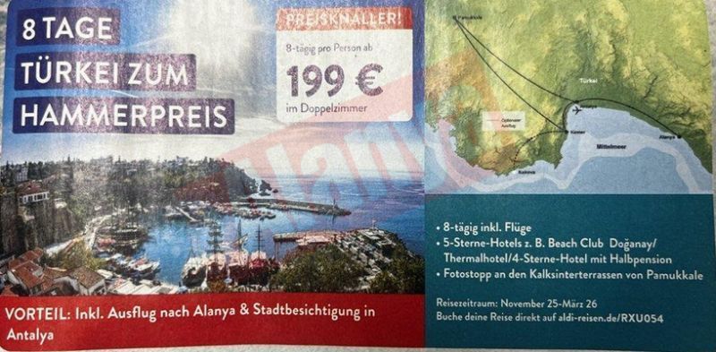 Almanya’daki bir süpermarket zinciri, Türkiye’ye yönelik “fırsat tatil paketleri” kapsamında dikkat çeken bir kampanyaya imza attı. Yalnızca 199 euro karşılığında 8 günlük Alanya tatili sunan bu paket, sosyal medyada büyük yankı uyandırdı.