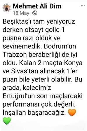 Mehmet Ali Dim, Konyaspor maçı sonrası yaptığı paylaşımda ise takımın başarısını ve gelecek sezona dair beklentilerini dile getirdi. Dim, "Alanyaspor’un kefeni yırttığını geçen hafta yazmıştım. Küme düşmeyeceğinden emindim. Kalan 2 maçtan 2 puan yeter demiştim. Konya’dan alınan 3 puan zaten bize fazlasıyla yetti. Önümüzdeki sezon aynı kabusu yaşamamak için yönetim doğru tercihler yapmak zorunda. Emeği geçenlere teşekkürler" ifadelerini kullanarak, takımın yeni sezona daha büyük hedefler doğrultusunda hazırlanması gerektiğinin altını çizdi.