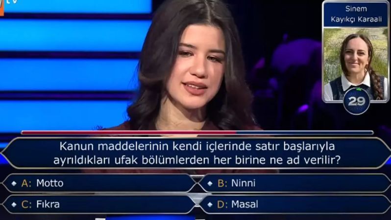 Şıklar arasında "motto", "ninni", "fıkra" ve "masal" yer alırken, doğru cevap "fıkra"ydı. Yarışmacı, doğru cevabı veremeyince telefon joker hakkını kullanarak hukuk hocasını aradı ve hocasından destek aldıktan sonra cevabı bildi.