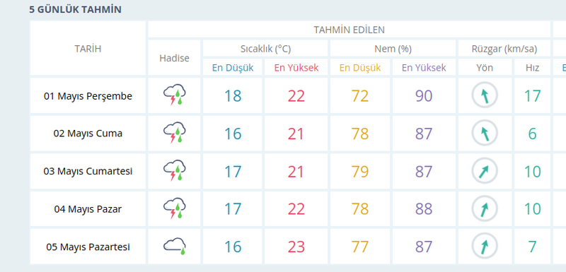 05 Mayıs Pazartesi günü ise hava kısmen açılacak ancak hafif yağmur ihtimali sürüyor. Sıcaklıklar 16-23°C arasında olacak. Nem oranı %77 ila %87 arasında kalacak. Rüzgar kuzeydoğudan 7 km/s hızla esecek.