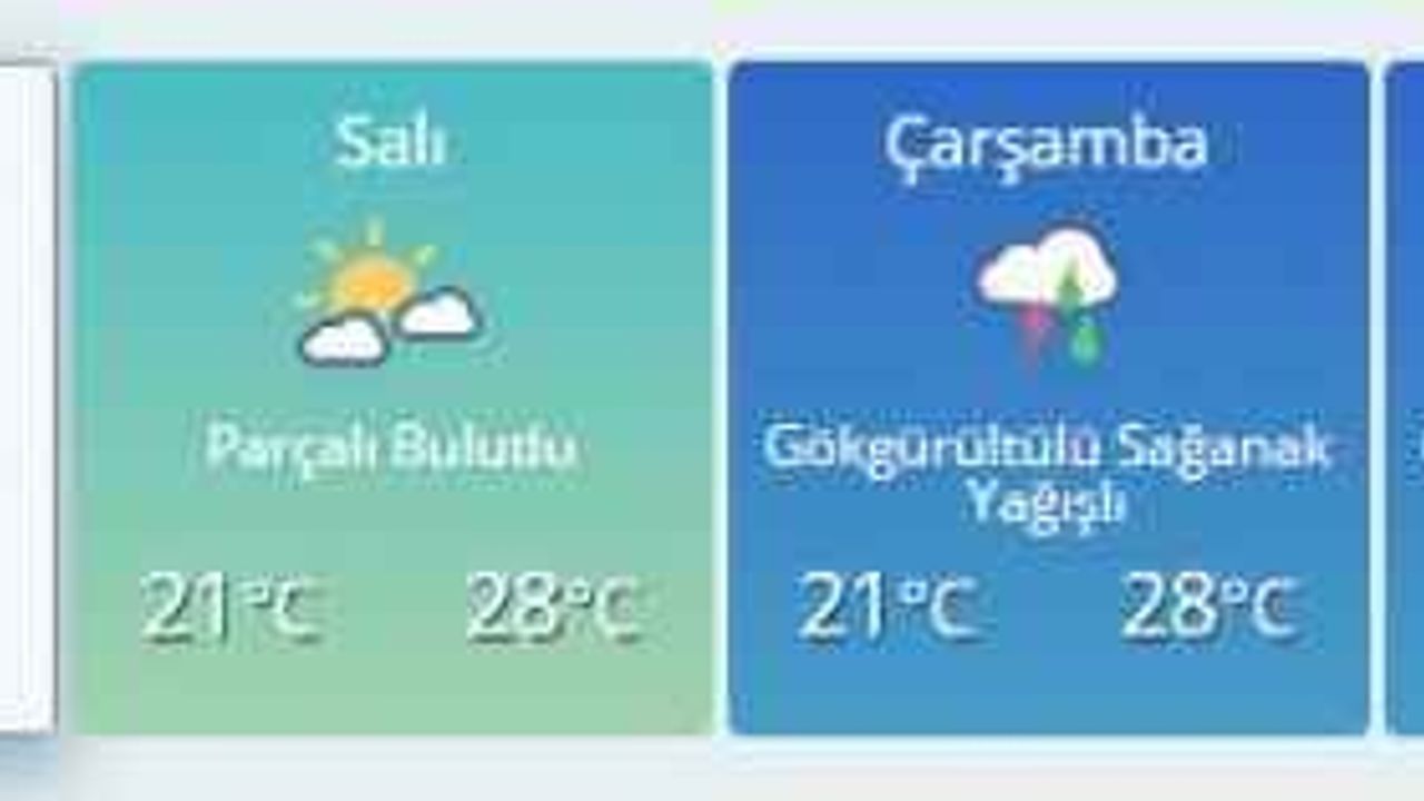 Salı günü , Parçalı bulutlu, en düşük sıcaklık 21, en yüksek sıcaklık 28 derece;