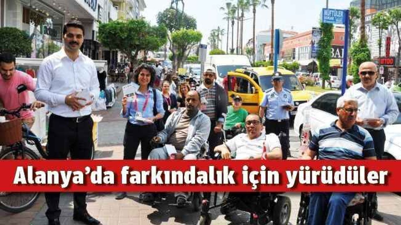 ALANYABelediyesi'nin koordinatörlüğünde Engelsiz Park ve Yaşam Merkezi'ne devam eden ortopedik engelliler, her yıl mayıs ayının ilk haftası kutlanan Trafik Güvenliği ve Eğitim Haftası nedeniyle yürüyüş düzenledi. Yürüyüşe akülü sandalyeleri ile katılan engelli bireylerin yanı sıra, Belediye Zabıta Müdürü Hasan Akın, Belediye Sosyal Yardım İşleri Müdürü Bilal Nurgül, Belediye Engelsiz Park ve Yaşam Merkezi Psikoloğu Esra Yemez, engelli yakınları ve vatandaşlar katıldı. Yürüyüşte, engelliler için düzenlenen kaldırımları işgal eden vatandaşlar, esnaflar, engellilere ayrılan park alanlarına park eden, motosiklet ve araç sahipleri uyarıldı. PTT binası önünden başlayıp Hükümet Meydanı önüne kadar devam eden farkındalık yürüyüşünde engelliler, yanlış park eden araç sahipleriyle zaman zaman yüz yüze de görüşerek duyarlılık istedi. Ayrıca aracının yanında olmayan sürücüler için de araba ve motosikletlere broşür bırakarak seslerini duyurmaya çalıştılar.