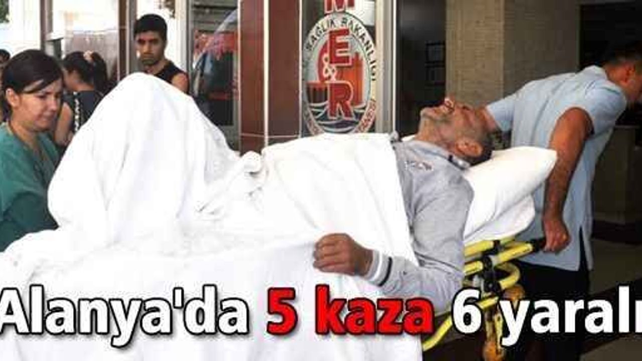 ALANYA'DA yaşanan 5 ayrı trafik kazasında 6 kişi yaralandı. Yaralılar kaldırıldıkarı hastanede tedavi altına alınırken, polis kazalarla ilgili soruşturma başlattı.