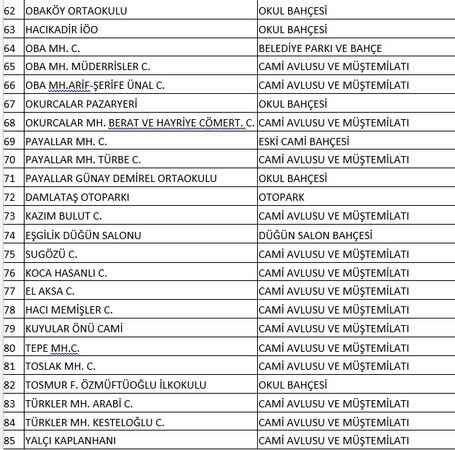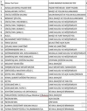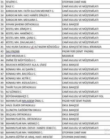 Alanya Müftülüğü tarafından yarın kılınacak Cuma Namazı için belirlenen camiler ise şöyle: Avsallar Fatih Camii, Cikcilli Hacıbaba ve Taşbaşı, Şanlı camileri, Alış Camii, Muhammet Müftüoğlu Camii, Çıplaklı Mahalle Camii, Değirmendere Mahalle, Kızılharman camileri, Demirtaş Yeni Damlar Camii, Giritlioğlu Mustafa Uğuz Camii, Güzelbağ Mahalle ve Fatih camileri, El Aksa Camii, Hacı Memişler Camii, Kale Camii, Kargıcak Fatih Sultan Mehmet, Hacı Hanife Dinler, Mevlana camileri, Kestel Dimçayı, Hanönü, Merkez Çarşı, Zavlaklar camileri, Asri Mezarlık Camii, Emine Özmüftüoğlu Camii, Konaklı Ali Şahin, Bacoğlu, Ketir, Kızılaliler camileri, Ali Gürses Camii, Büyükhasbahçe Camii, Mahmutlar Adem Ünal, Merkez, Oktay-Hanife Cebeci, Yarderesi camileri, Oba Müderrisler, Arif Şerife Ünal camileri, Okurcalar Berat-Hayriye Cömert Camii, Payallar Mahalle, Türbe camileri, Kazım Bulut Camii, Sugözü Koca Hasanlı camileri, Kuyular Önü Camii, Tepe Mahalle Camii, Toslak Mahalle Camii, Türkler Mahalle, Arabi, Kesteloğlu camileri. Müftülük yanı sıra bazı pazar yeri, düğün salonu, otopark, okul bahçesi gibi alanların da Cuma namazı kılınması için kullanılacağını açıkladı.