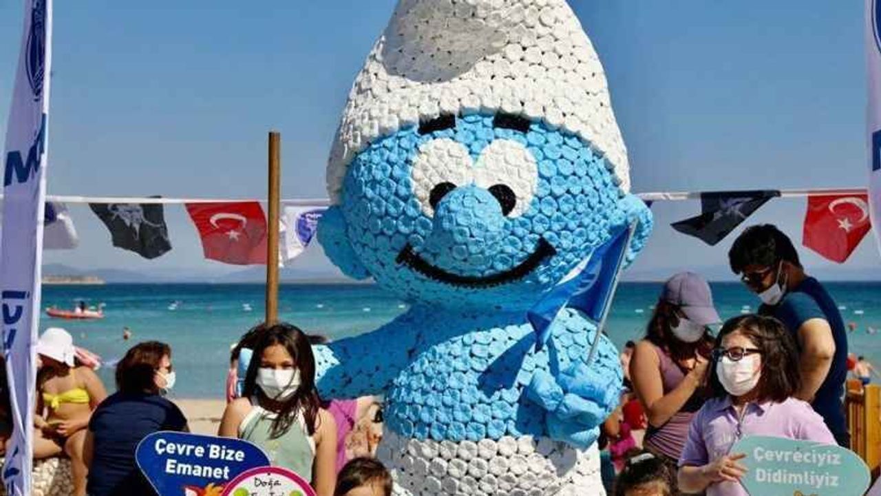 Denizden toplanan 2 bin 225 adet pet şişe ile yapılan Şirinler heykeli, Dünya Çevre Günü’nde plastik kirliliği sorununa dikkat çekti.
