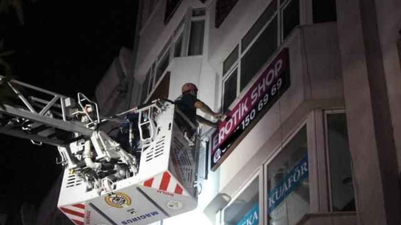 Ayrıca kentin en işlek caddesine bakan üzerinde 'Erotik Shop' yazan tabela da itfaiye tarafından akşam saatlerinde vinçle indirildi. Çok sayıda vatandaş, ekiplerin çalışmalarını merakla izledi. Bazı vatandaşlar, tabelanın indirilmesinin doğru olduğunu savundu. Polis ekipleri de bölgede herhangi bir provokasyona karşı güvenlik önlemi aldı.