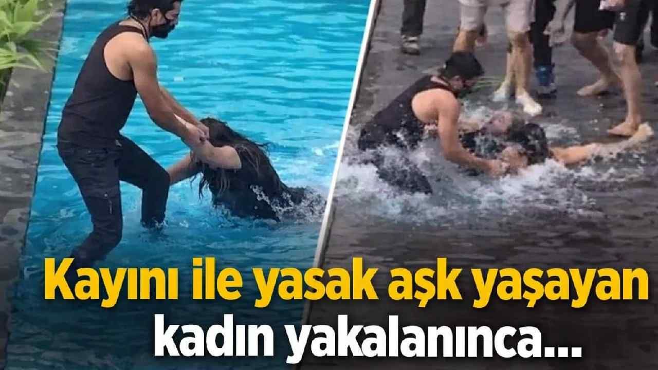 Yasak ilişki iddiasının ortaya çıkmasının ardından çıkan tartışma dehşete dönüştü. Güvenlik kamerasına yansıyan olayda hamile kadın havuzda ölümle burun buruna geldi.