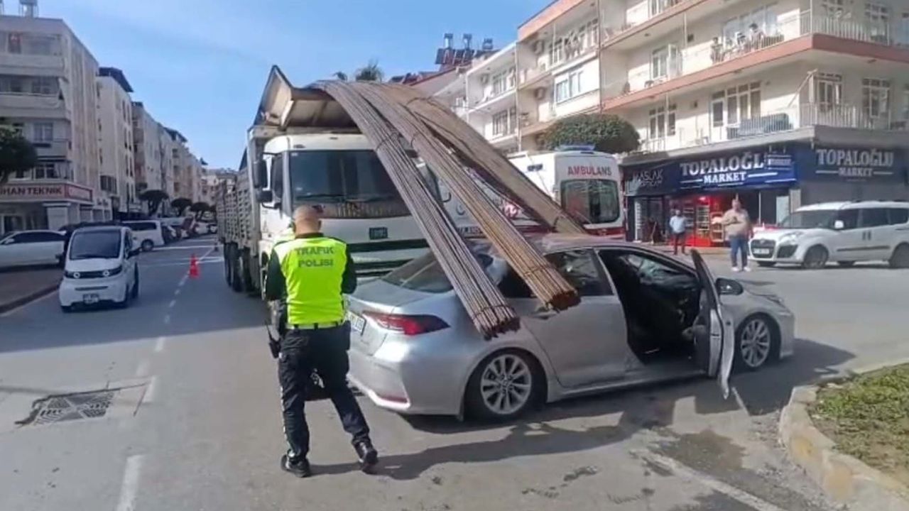 Manavgat’ta inşaat demiri yüklü kamyonun şoförü, kavşaktan dönüş yapmak isteyen sürücünün otomobiline çarpmamak için ani fren yaptı. Kamyonun kasasında yüklü demir çubuklar, savrularak otomobilin tavanını deldi. Kaza, güvenlik kamerasına yansıdı