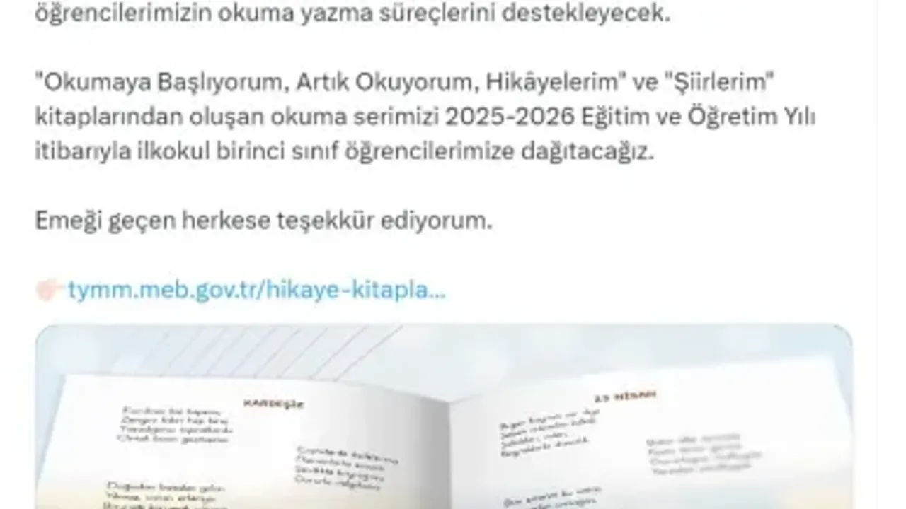 Bakan Tekin, sosyal medya hesabından yaptığı açıklamada, "İlk okuma yazma öğretimini destekleyen okuma kitaplarımız hazır. Türkiye Yüzyılı Maarif Modeli hedeflerimiz doğrultusunda akademisyenler ve öğretmenlerimiz tarafından hazırlanan okuma kitaplarımız, birinci sınıf öğrencilerimizin okuma yazma süreçlerini destekleyecek. 'Okumaya Başlıyorum, Artık Okuyorum, Hikayelerim' ve 'Şiirlerim' kitaplarından oluşan okuma serimizi 2025-2026 eğitim ve öğretim yılı itibarıyla ilkokul birinci sınıf öğrencilerimize dağıtacağız. Emeği geçen herkese teşekkür ediyorum" ifadelerini kullandı.