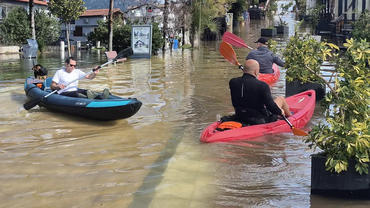 Köyceğiz’in Gülpınar Mahallesi’nde bir kişi, sel sularının kapladığı yolda kano ile ilerledi. O anlar çevrede bulunan bir vatandaş tarafından cep telefonu kamerasıyla kaydedildi. Görüntüler kısa sürede sosyal medyada yayılırken, bölgedeki su seviyesinin ulaştığı boyutu da gözler önüne serdi.