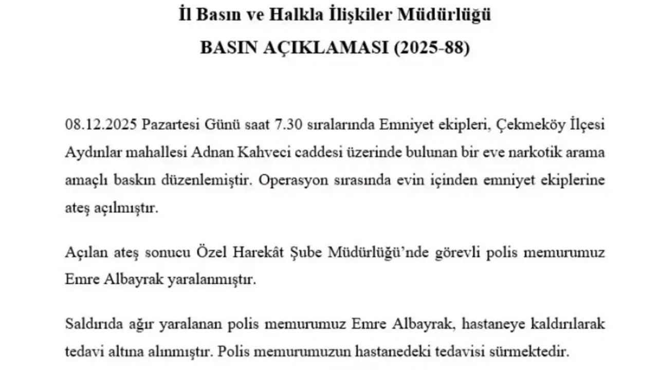 İstanbul Valiliği, olayla ilgili sabah saatlerinde yazılı açıklama yaptı. Açıklamada, ekiplerin narkotik arama amacıyla adrese gittiği, saldırıda yaralanan polis memuru Emre Albayrak’ın hastaneye kaldırıldığı, çatışmada bir şüphelinin öldürüldüğü, iki kişinin ise sağ yakalandığı belirtildi.