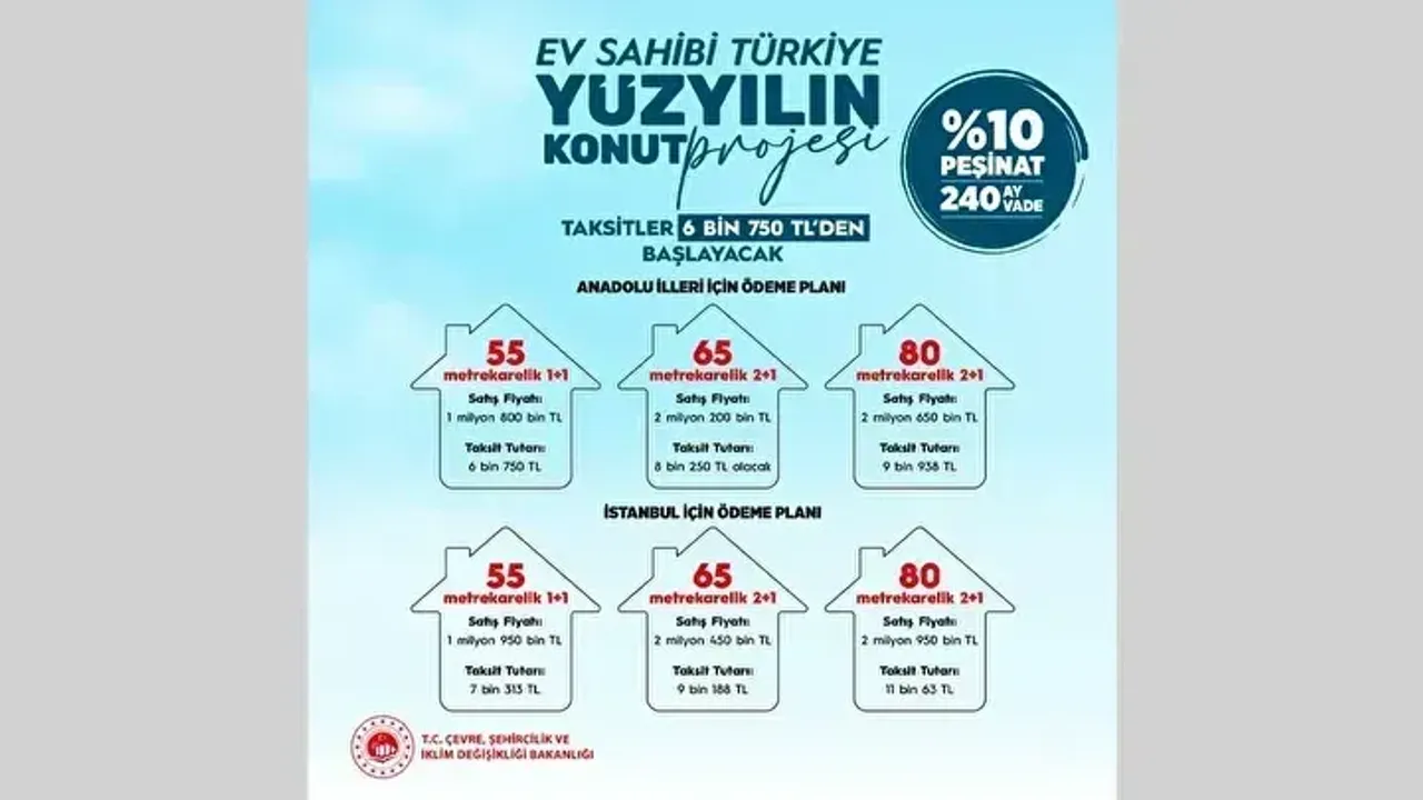 Türkiye, “Yüzyılın Konut Projesi” ile 81 ilde 500 bin sosyal konut inşa edecek. Çevre, Şehircilik ve İklim Değişikliği Bakanlığı koordinesinde TOKİ tarafından yürütülecek proje, hem afet riskine karşı güvenli yaşam alanları oluşturmayı hem de vatandaşların uygun maliyetlerle konuta erişimini sağlamayı hedefliyor. Konutlar yüzde 10 peşinat ve 240 aya varan vade imkânlarıyla satışa sunulacak.