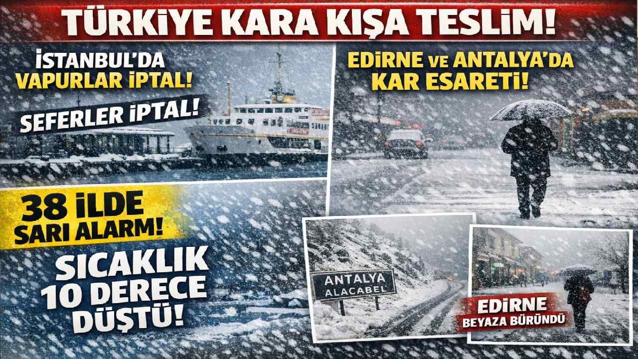 Özellikle İstanbul’da kar yağışı ve vapur iptalleri dikkat çekerken, Antalya’nın yüksek kesimlerinde kar kalınlığı 10 santimetreye ulaştı. 38 il için sarı kodlu meteorolojik uyarı yayımlandı.