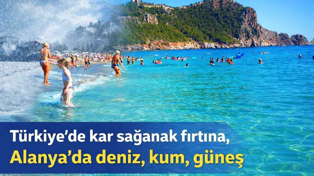 Türkiye’nin birçok noktasında kar, sağanak ve fırtına günlük yaşamı zorlaştırırken, Antalya’nın Alanya ilçesinde tam tersi bir tablo yaşandı. Hava sıcaklığının 21 dereceye kadar yükseldiği ilçede, özellikle dünyaca ünlü Kleopatra Plajı yerli ve yabancı turistlerle doldu. Sabah saatlerinden itibaren sahile inen vatandaşlar, uzun süredir beklenen güneşli havayı fırsat bildi. Kimisi denize girerek sezonu erkenden açtı, kimisi ise sahilde yürüyüş yapmayı tercih etti.