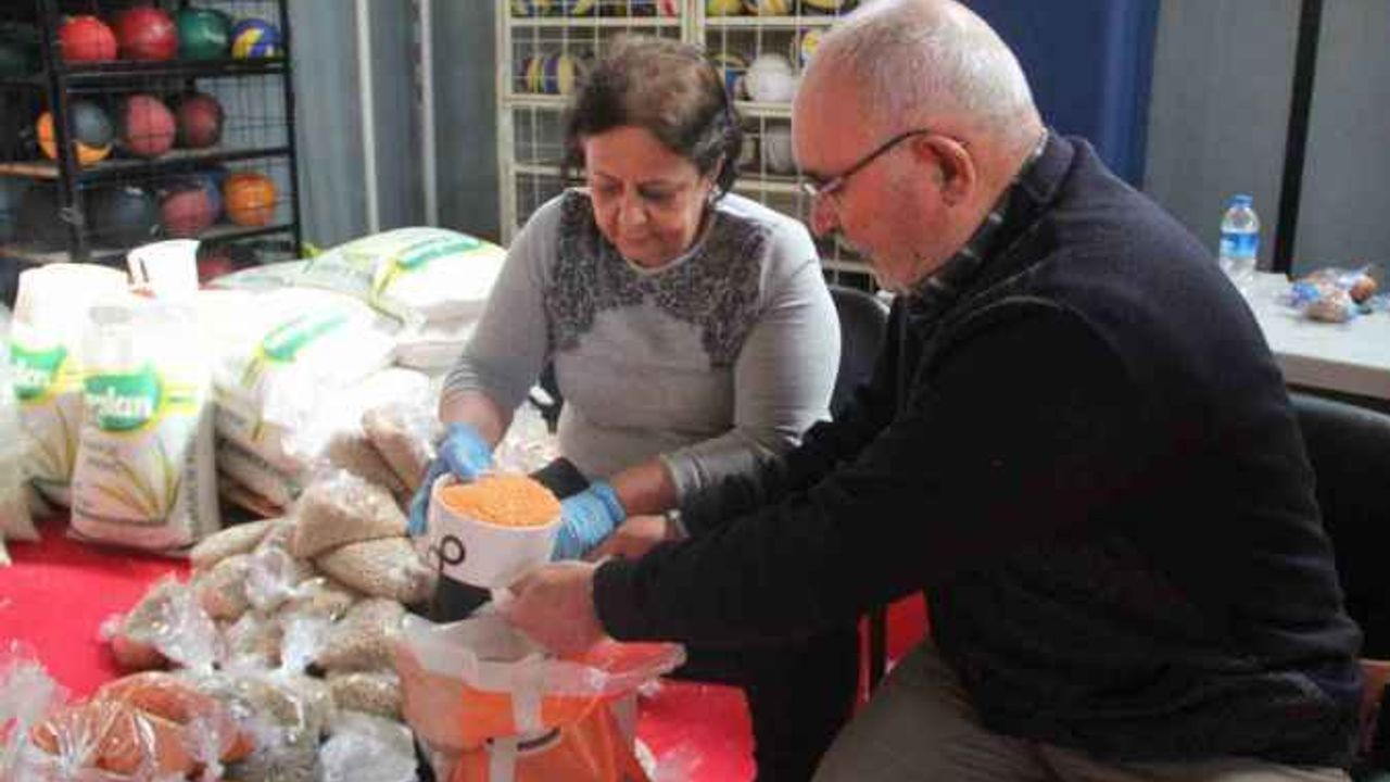Antalya’da tekvandocu ev hanımları, kentte yaşayan depremzedelerin kullanması için gıda ürünlerini imece usulü paketliyor. Depremde 14 akrabasını toprağa veren 70 yaşındaki Aziz Karakuş da acısını bir kenara bırakıp çalışmalarda yer alıyor.