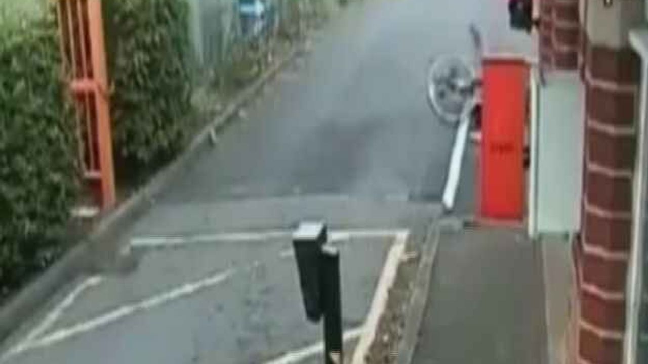 Bisiklet sürücüsü 'Biraz daha hızlı gidersem kurtarırım.” diye düşünüyor fakat sonuç beklediği gibi olmuyor. İngiltere'de sabırsız bisiklet sürücüsü, otomobil için açılan kapıdan geçmeye çalışıyor. Aracın ardından...