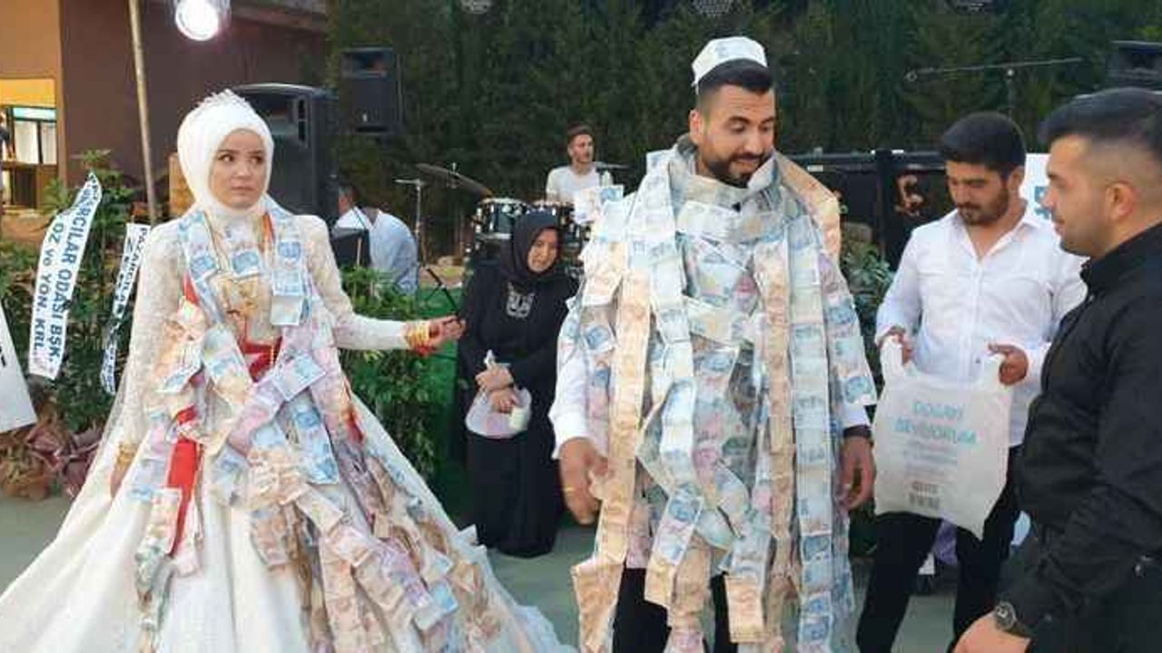 Antalya’nın Aksu ilçesinde otomotiv sektörünün genç patronu Seyit Ahmet Akış ile Ahmet Çelik’in kızı Zeynep Çelik’in pandemi nedeniyle üç kez ertelenen düğünü, tam kapanma sürecinin ardından normalleşmeye geçilmesi ile gerçekleştirilebildi. Denizim Park Restoran’da düzenlenen kır düğününe davetlilerin ilgisi büyük olurken, bin 500 kişinin düğüne katılması dikkat çekti. Düğün törenlerini özleyen davetliler, takı törenine geçildiğinde gelin ve damada para ve takı takmak için adeta birbirleri ile yarıştı. Takı töreni öncesi sevdikleriyle ve yakınlarıyla oynayıp eğlenen gelin ve damat, takı töreninden sonra ise hareket edemez hale geldi. Damat ile gelini paraya boğan davetliler, damadı adeta ‘para ağacı’na çevirdi. Damadın arkadaşlarının 100 liralık banknotları rulo halinde takmaları dikkat çekti. Takıların içinden çeklerin çıkması ise sürpriz oldu. Genç çift, düğünden sonra bu hafta balayına çıkacak.