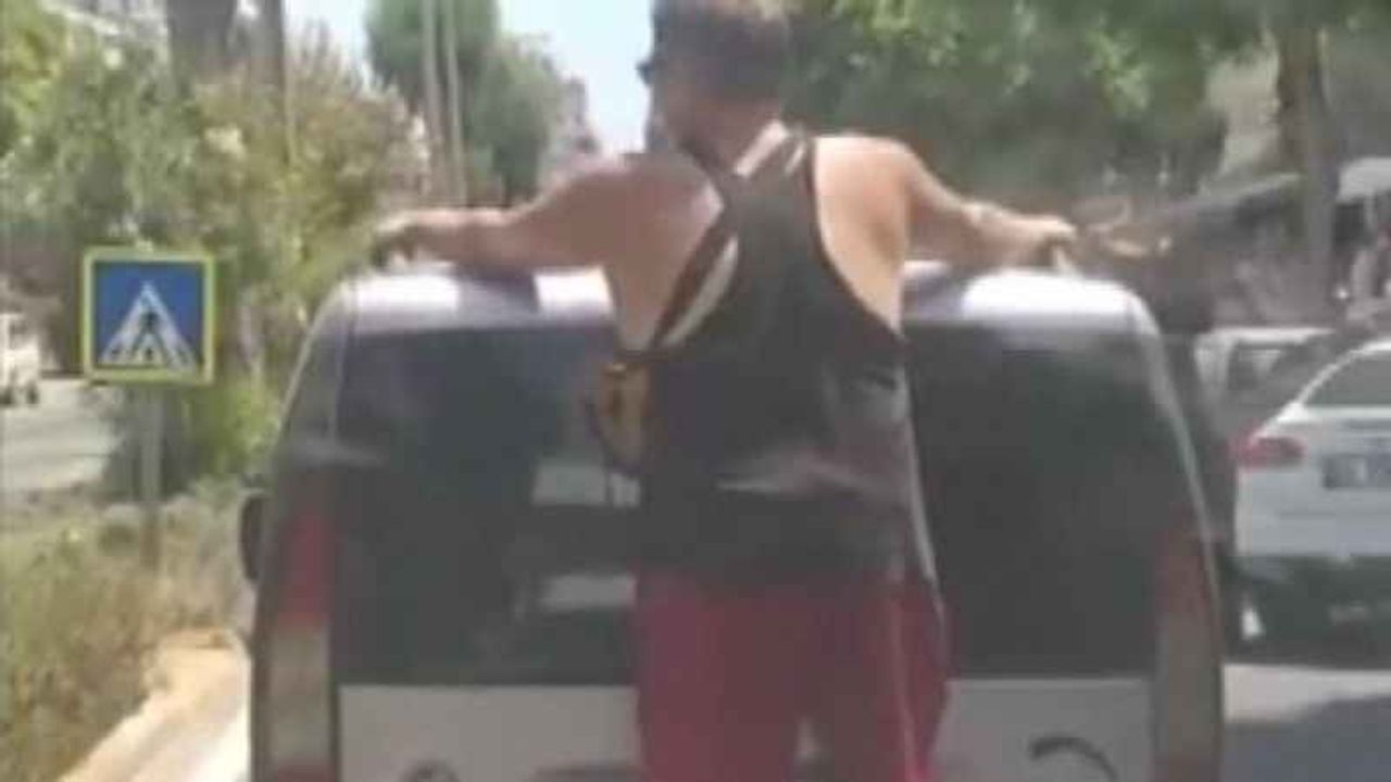 Alanya’da hafif ticari aracın arka tamponunda bir kişinin seyahat etmesi cep telefonu kamerasıyla görüntülendi.