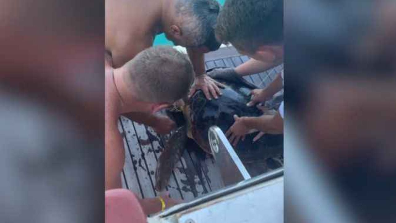 Alanya’da oltaya takılan caretta caretta, tur teknesi kaptanı tarafından kurtarılarak denize salındı