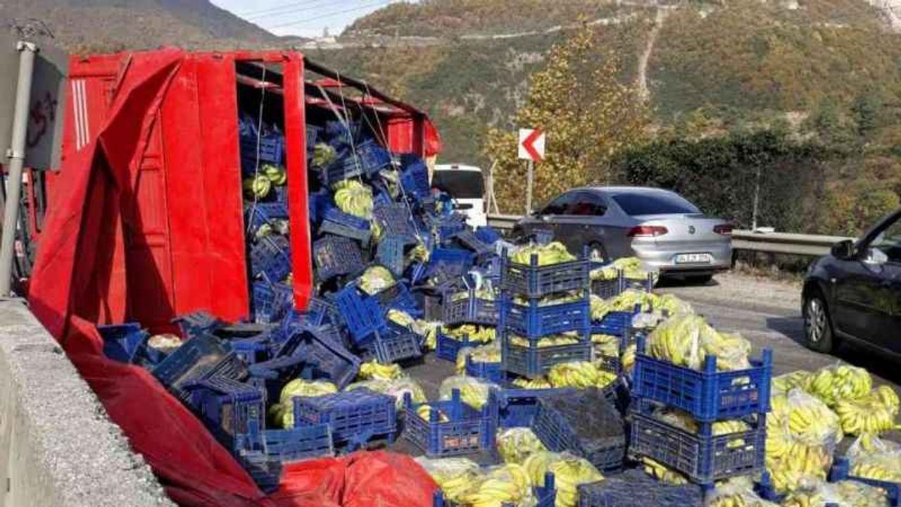 Sakarya’nın Geyve ilçesi D-650 kara yolunda sürücüsünün kontrolünden çıkan meyve yüklü kamyon devrildi. Kamyonun içerisinde bulunan muzların yola savrulması neticesinde yol bir süre trafiğe kapandı. Kamyonun Alanya'dan yola çıktığı ihtimali üzerinde duruluyor