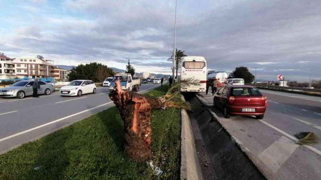 Manavgat'tan Alanya'ya sehir halinde olan otobüs, refüjdeki palmiyeyi ağacını devirdikten sonra tahliye su kanalında askıda kaldı