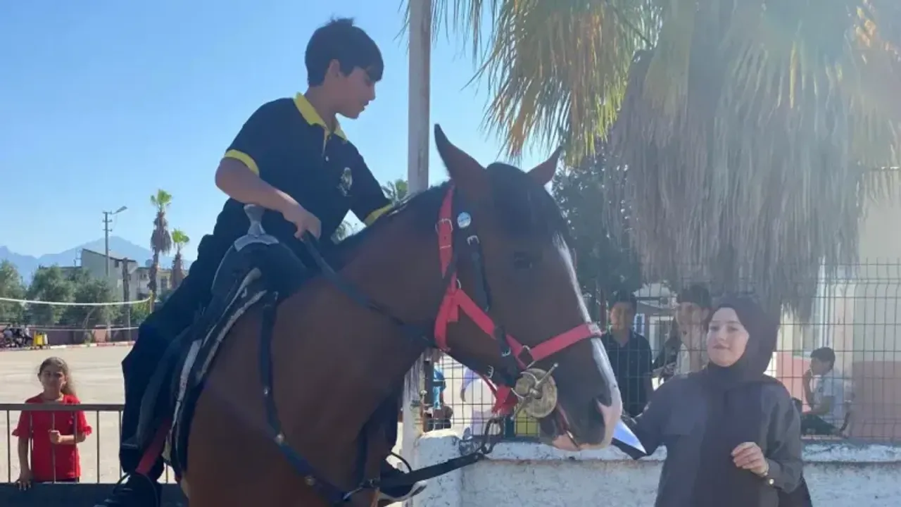 Serik'te 2024-2025 eğitim öğretim yılının son gününde 6. sınıf öğrencisi Çınar Önder (12), babasının kendisine hediye ettiği atın üzerinde okula geldi. Çınar Önder hem karne heyecanı yaşadı hem de hayaline kavuştu.
