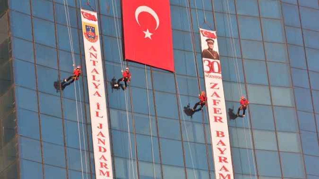 .JAK üyesi jandarmalar, Muratpaşa ilçesinde bulunan 21 katlı binanın çatısından aşağı sarkarak " Antalya İl Jandarma Komutanlığı" ve " 30 Ağustos Zafer Bayramı kutlu olsun" yazılarının yer aldığı flamaları yukarıya çekti.