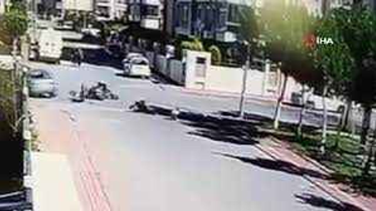 Antalya’da kontrolsüz kavşakta motosiklet ile otomobilin çarpışması sonucu meydana gelen kazada motosiklet sürücüsü ve arkadaşı yaralandı. Kameralara yansıyan olayda sürücünün ve arkadaşının havada takla atarak yere düştüğü görüldü.