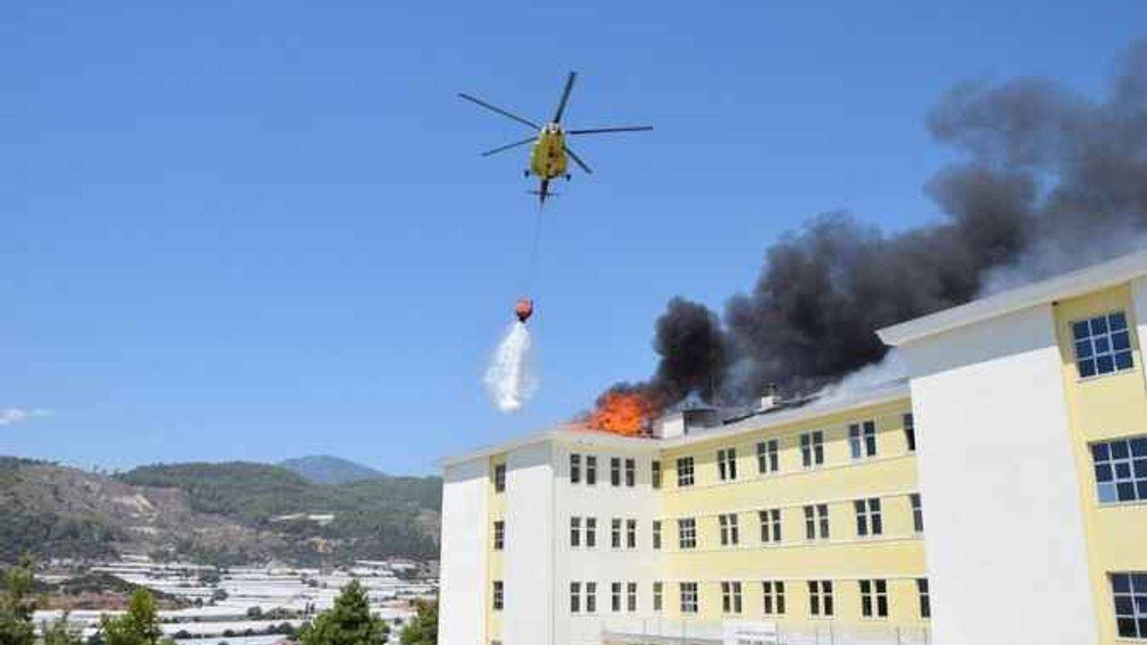 Antalya’nın Kumluca ilçesinde fen lisesinin yanındaki 4 katlı yurdun çatısında çıkan yangın helikopter desteği ile söndürüldü.