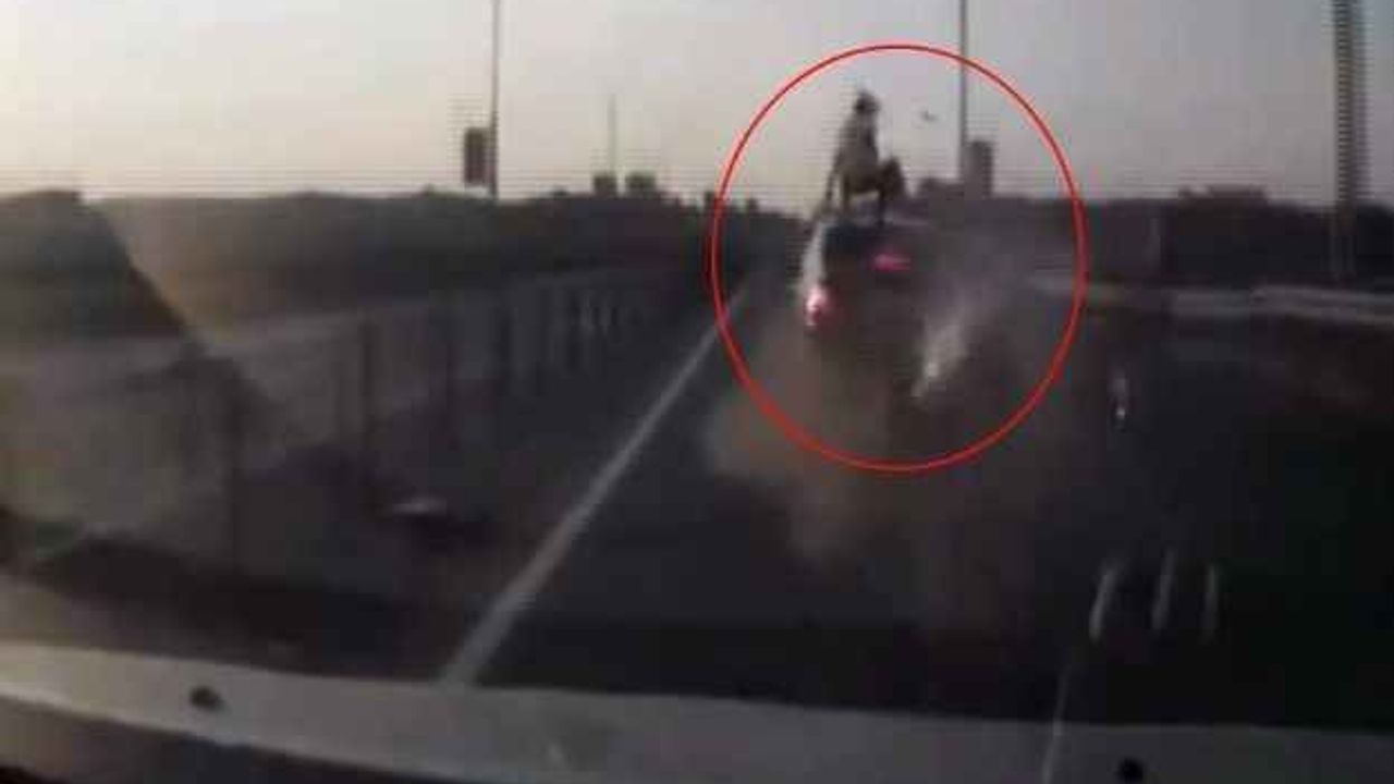 Böyle kaza görüldü ama böyle kurtuluş görülmedi.Rusya'da şerit değiştiren otomobile arkadan çarpan motosikletin sürücüsü takla attı ve çarptığı aracın üzerine düştü. Motosiklet paramparça olurken, bir akrobat gibi aracın üzerine...