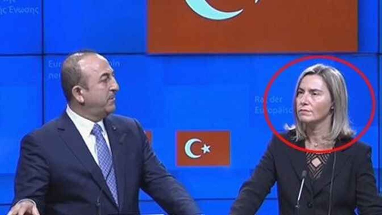 Alanyalı Dışişleri Bakanı Mevlüt Çavuşoğlu, AB temsilcisi Mogherini ile birlikte Brüksel'de kameraların karşısına geçti. Çavuşoğlu'nun kullandığı ifadeler karşısında ne diyeceğini bilemeyen bürokratın yüz ifadesi ekranlara...