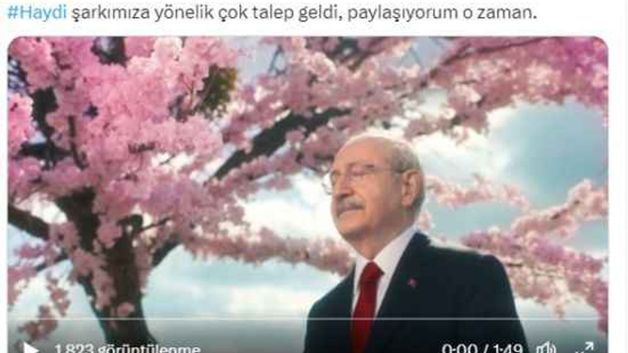 CHP Genel Başkanı Kemal Kılıçdaroğlu, bu akşam Twitter hesabında yeni seçim şarkısını paylaştı. Kılıçdaroğlu Twitter hesabında paylaştığı videoya; “Haydi şarkımıza yönelik çok talep geldi, paylaşıyorum o zaman” notunu düştü.