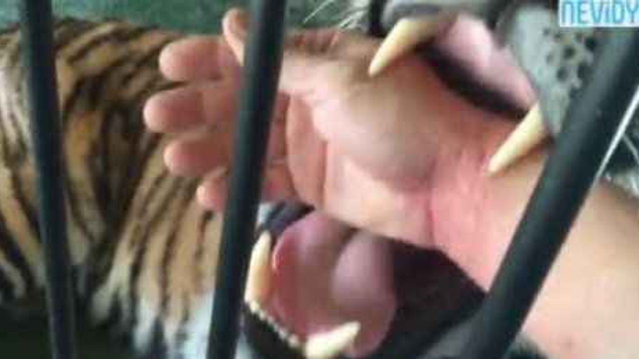 Kolunu kaplanın kafesinden içeri sokan adam ilginç anlar yaşadı. Eğitimli kaplan adamın kolunu ağzına aldı fakat ısırmadan bir süre oynayıp bıraktı.