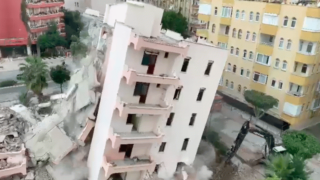 Alanya’da kentsel dönüşüm çalışmaları kapsamında yıkılan binanın başka bir binanın üzerine göçtüğü o anlara ait yeni görüntüler ortaya çıktı